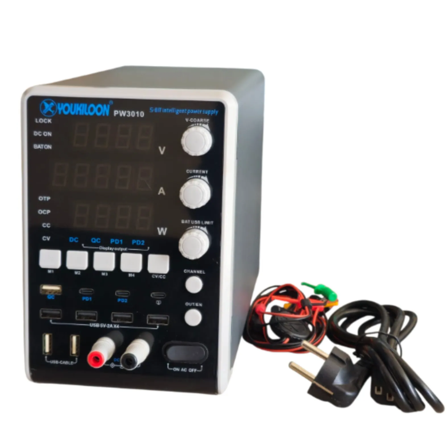 منبع تغذیه YOURLOON PW3010 یک دستگاه سوئیچینگ دیجیتال پیشرفته است که به عنوان یکی از مدلهای پرفروش و مقرونبهصرفه در بازار ابزارهای الکترونیک (سال ۲۰۲۵) شناخته میشود. این مدل از برند YOURLOON (چینی، مشابه Wanptek یا Longwei) طراحی شده و برای کاربردهای دقیق مانند تعمیر موبایل، تست مدارهای PCB، شارژ باتری و پروژههای DIY ایدهآل است. با نمایشگر ۴ رقمی LED، خروجی USB و حفاظتهای هوشمند، جایگزین عالی برای مدلهای پایه مانند Longwei PS-3010DF محسوب میشود. بر اساس بررسیهای کاربران در یوتیوب و فرومها، دقت بالا و نویز کم آن (کمتر از ۱۰mV) برای کارهای حساس الکترونیک برجسته است.