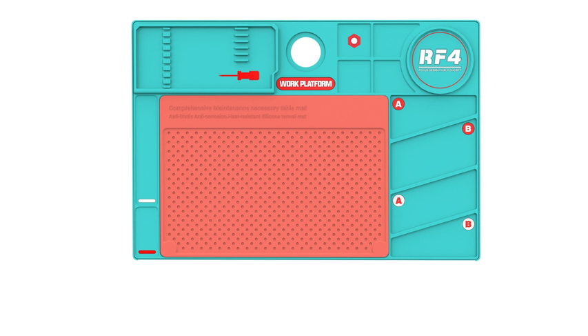 پد نسوز سیلیکونی مدل RF-PO2 از برند معتبر RF4، یک زیرلوپی حرفهای و مقاوم در برابر حرارت است که برای تعمیرکاران موبایل، لپتاپ و بردهای الکترونیکی طراحی شده است. این پد با طراحی دولایه و ساختار مهندسیشده، سطحی ایمن، منظم و ضد لغزش را برای انجام تعمیرات حساس فراهم میکند.